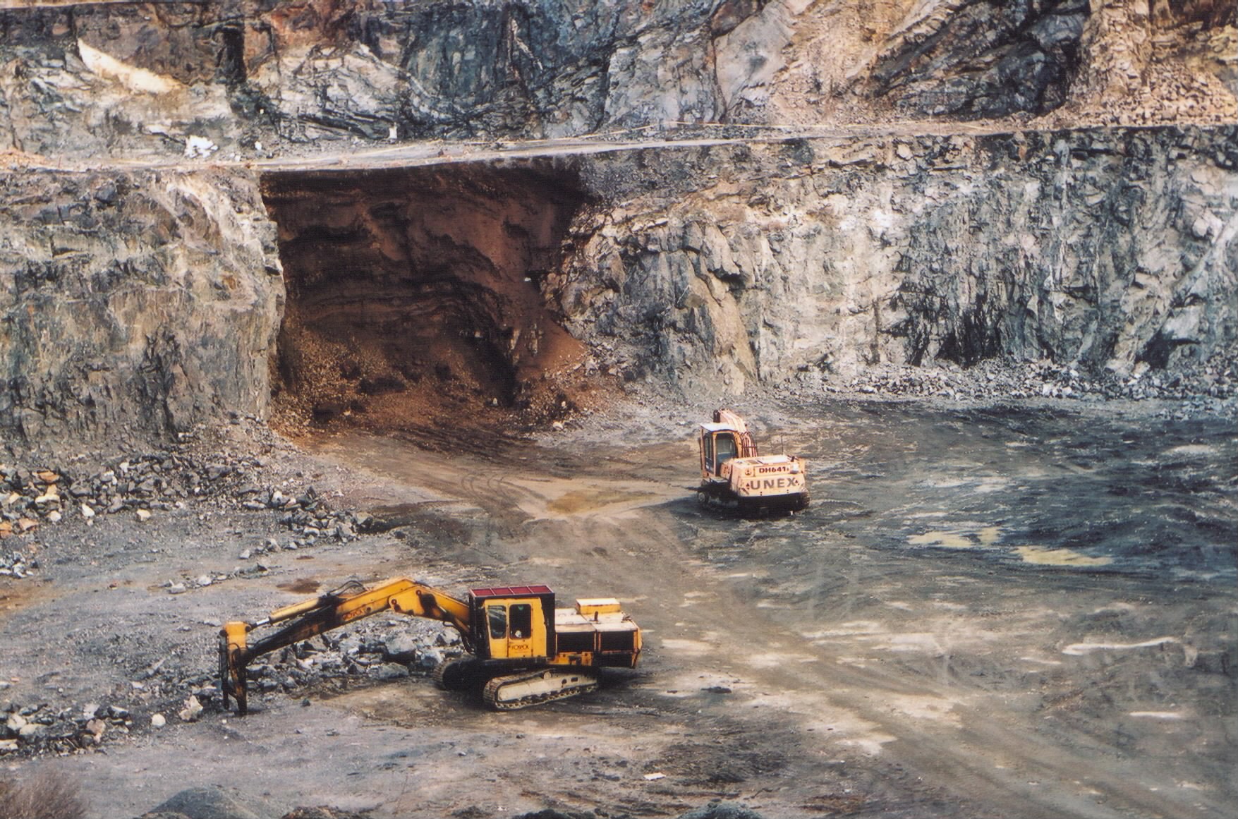 Těžbou odkrytá chodba Fe-dolu z období 2. sv. války. Je zřetelné, že špičky státu společně s nahnilou strukturou prorostlou korupcí, razí finančně velmi výhodná hesla: odtěžit, zastřelit, zasypat, zabetonovat, vymazat! Styďte se!