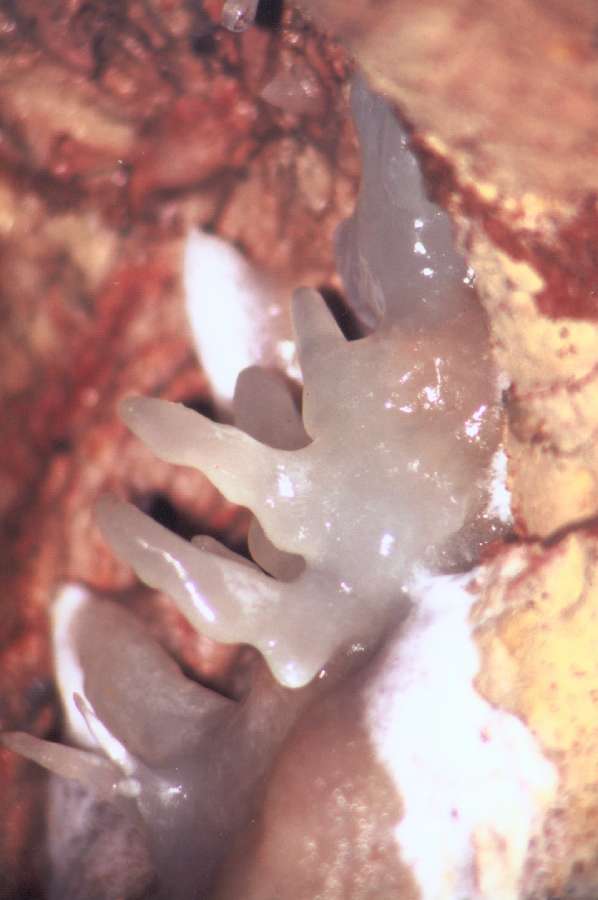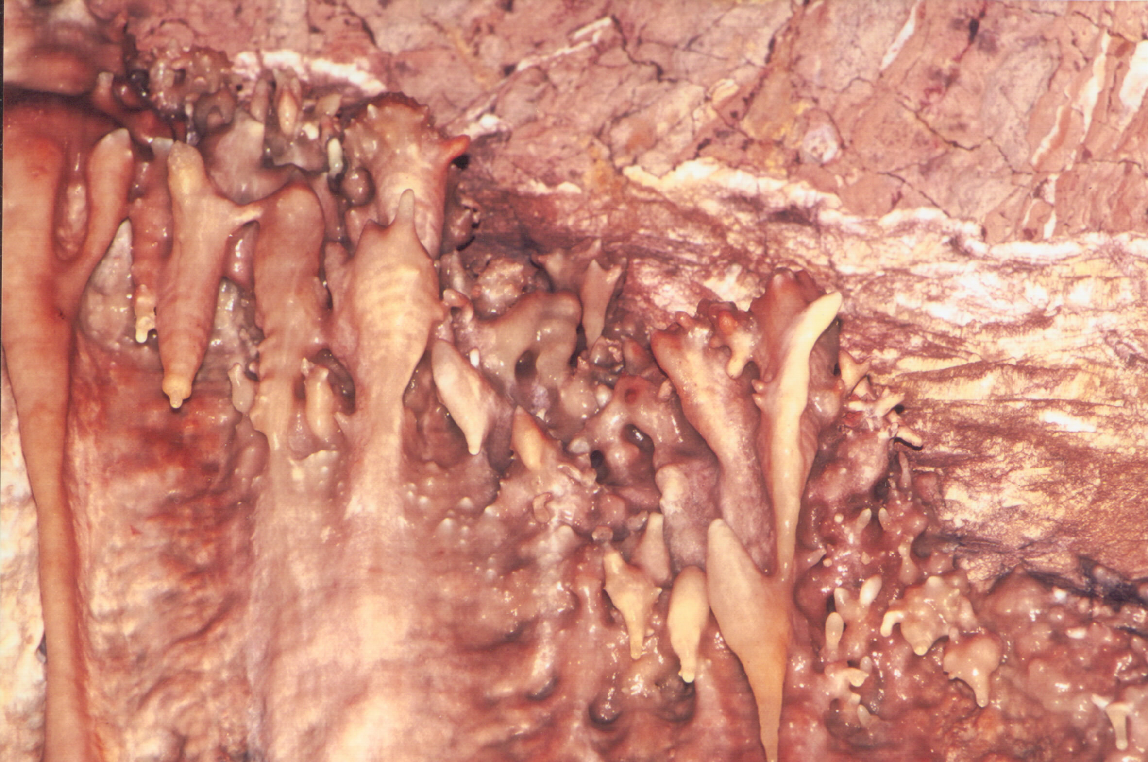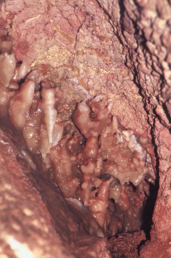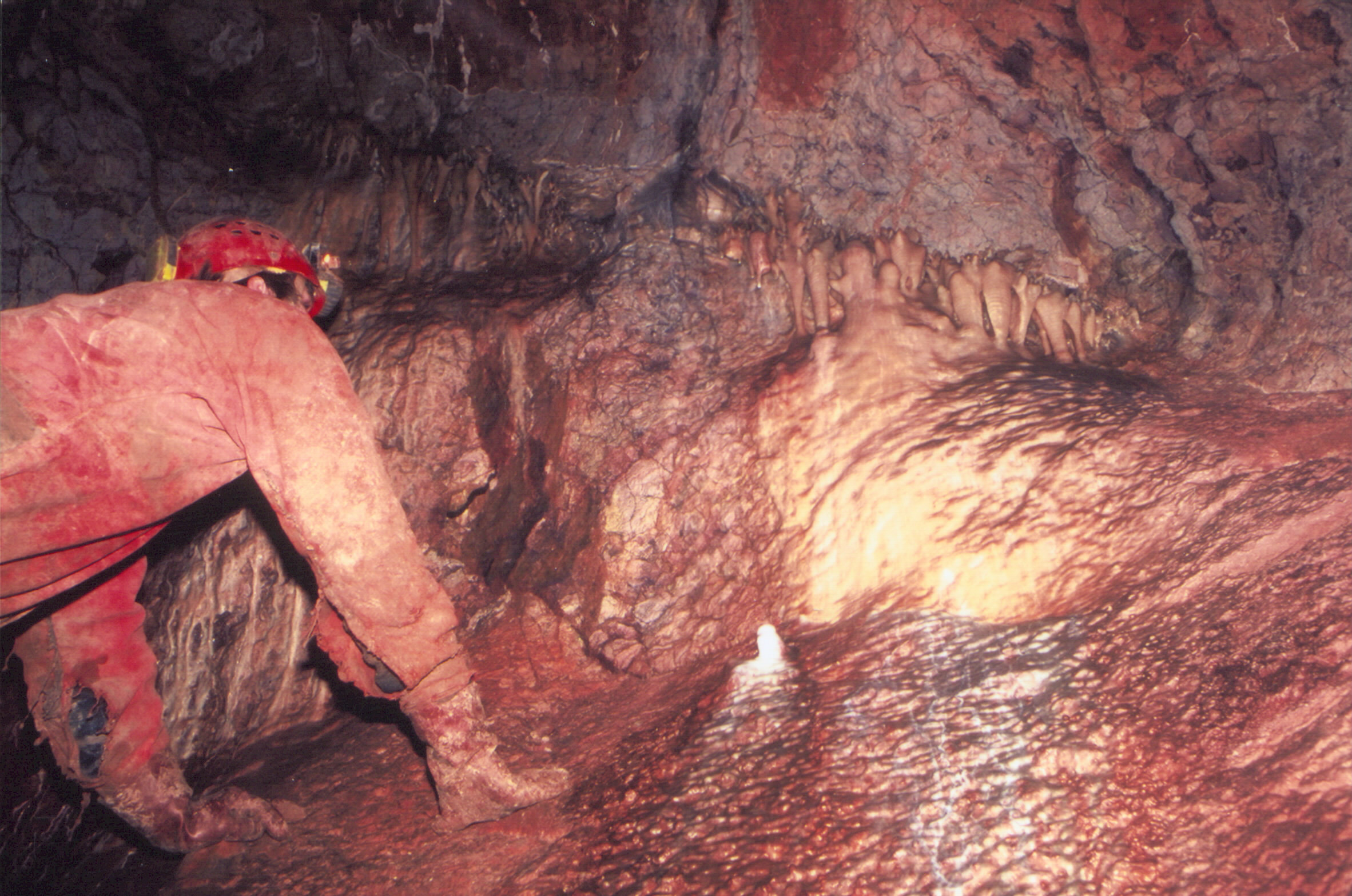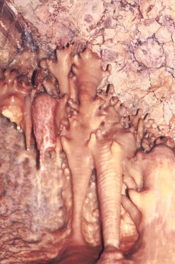 Komín nad Říceným dómem. Horizontální pruh je tvořený živou, koncentrovanou výzdobou. Vynikají zde různé typy excentrických forem. Foceno pomocí teleobjektivu.