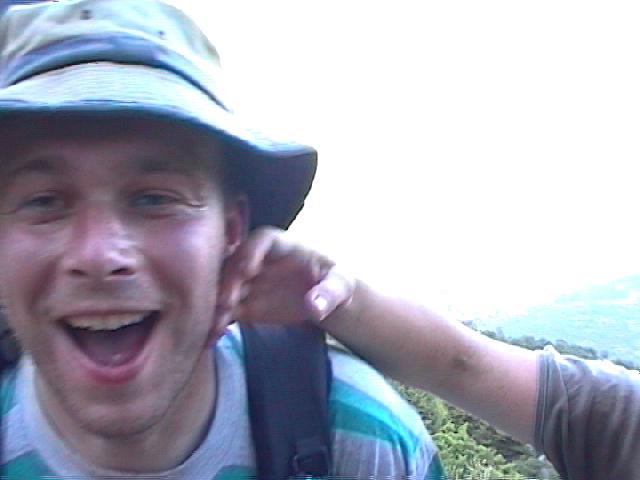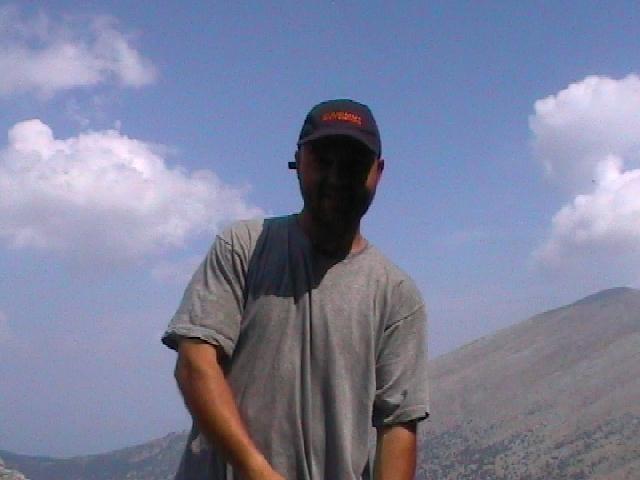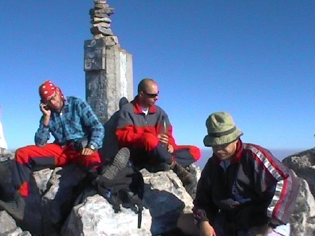Vrchol Olympu. 8:30. A hned je tu opar. Je potřeba taky zavolat domů, aby mamka věděla ...