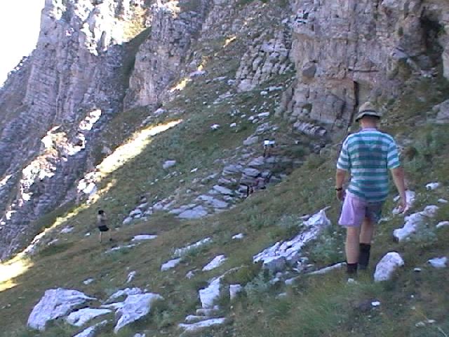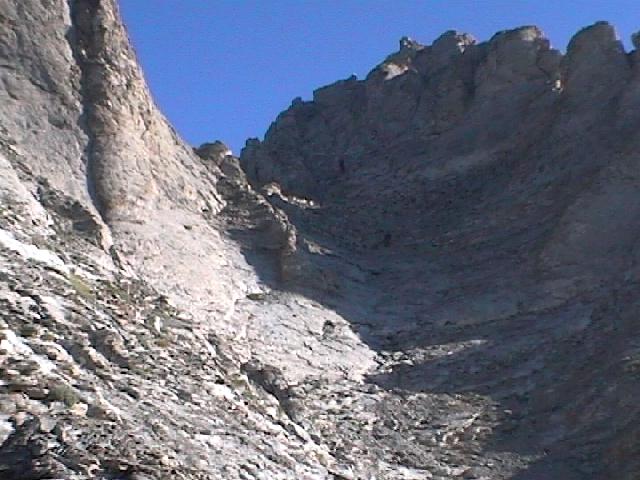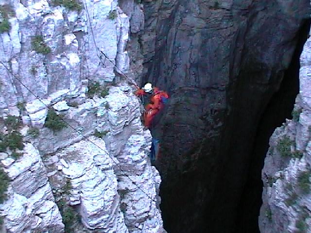 Vystrojování. Krátký traverz, 3 přepínky, pak dolů asi 170m, firnový svah 10m a znova 210m dolů 0,5 až 2m od stěny.