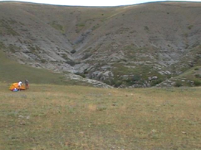 Konečně nahoře. Asi 32°C ve výšce cca 2000 m.n.m. Na druhém skalnatém ''prstu'' bude tábor.